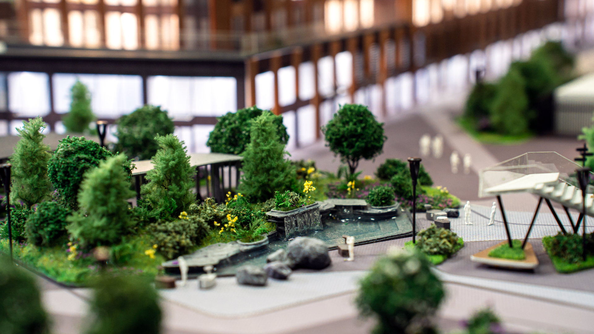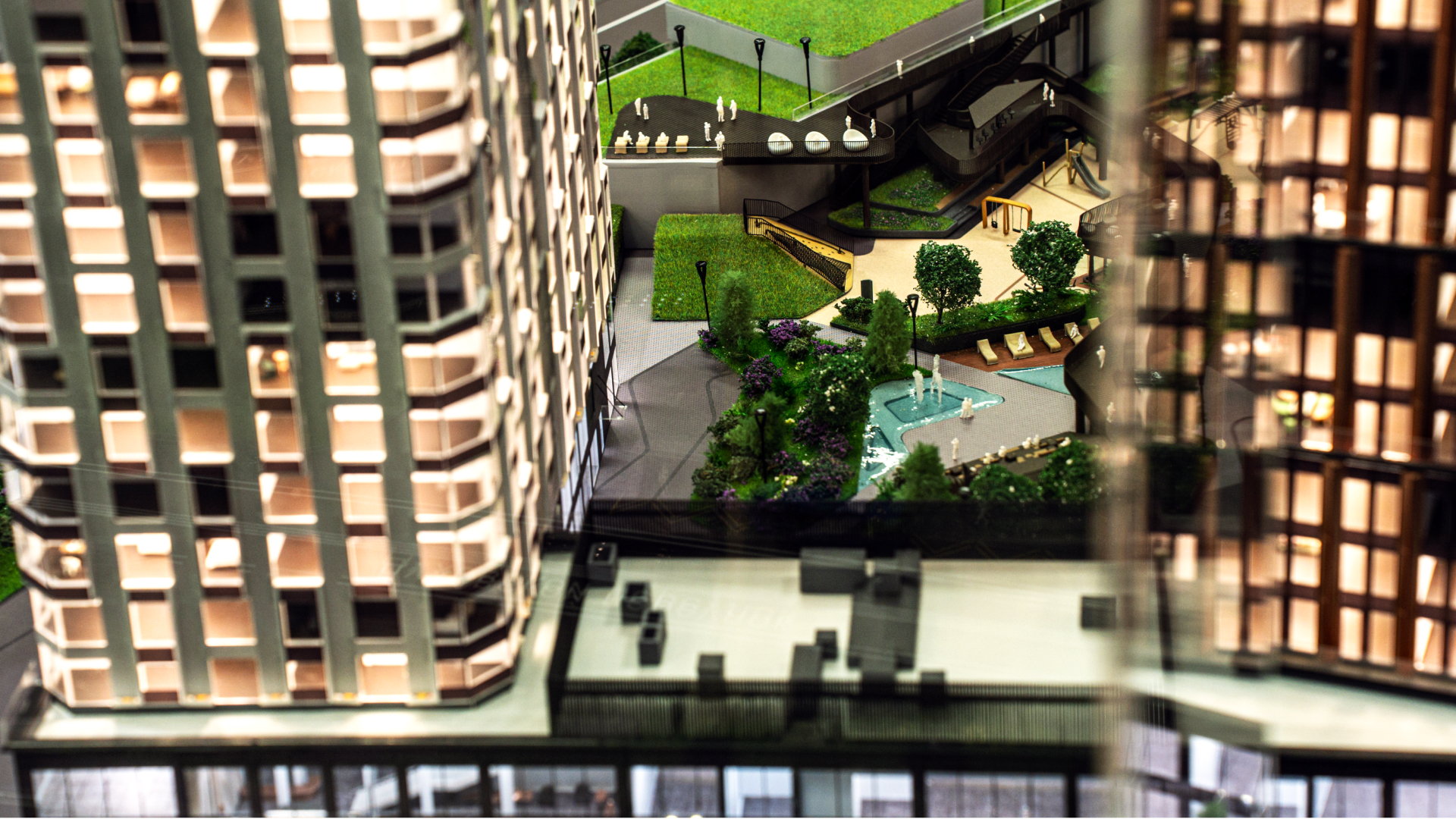 Макет выполнен в масштабе 1:125 с габаритами 2050×1540 мм и высотой до 1000 мм. Это крупная и технически сложная модель, объединяющая несколько высотных башен, развитую инфраструктуру и обширную территорию благоустройства. В композицию вошли детские площадки, террасы, фонтаны, ресторан, лаундж-зоны, прогулочные маршруты и мостовые переходы — всё, что формирует комфортную и современную городскую среду.