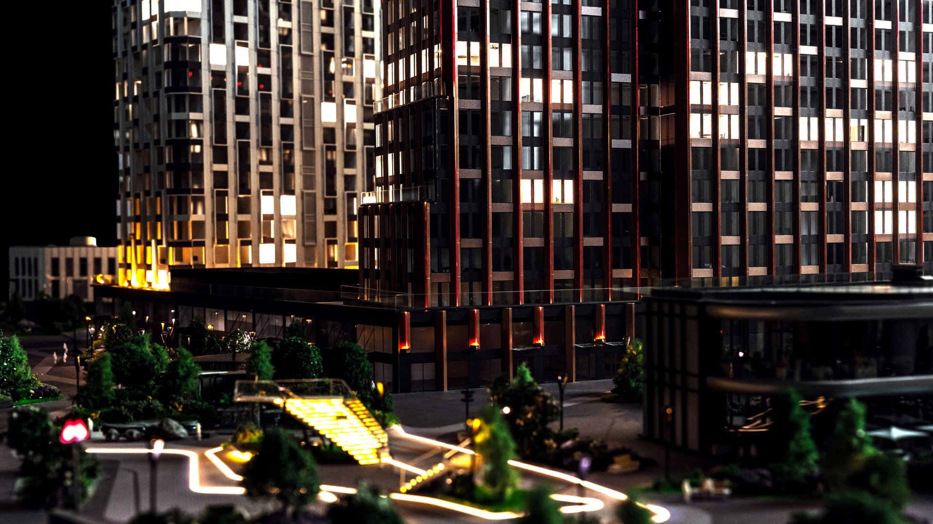 Одной из ключевых особенностей проекта стала полная электрификация макета. Реализована многоуровневая система освещения: подсветка стилобата, фасадов, отдельных квартир и всей территории благоустройства. Свет в данном случае выполняет не только декоративную, но и функциональную роль, помогая акцентировать планировочные решения и структуру комплекса.